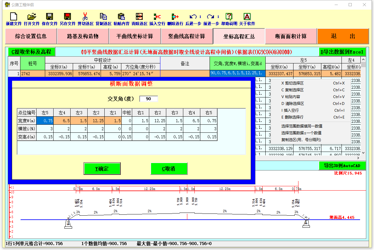 坐标也会自动重新计算。(建议宽度、横坡度填写时先去除自动推算功能,只填写宽度、横坡度变化处的数值,然后再加上自动功能,空白的格内就会自动填上满意的结果);